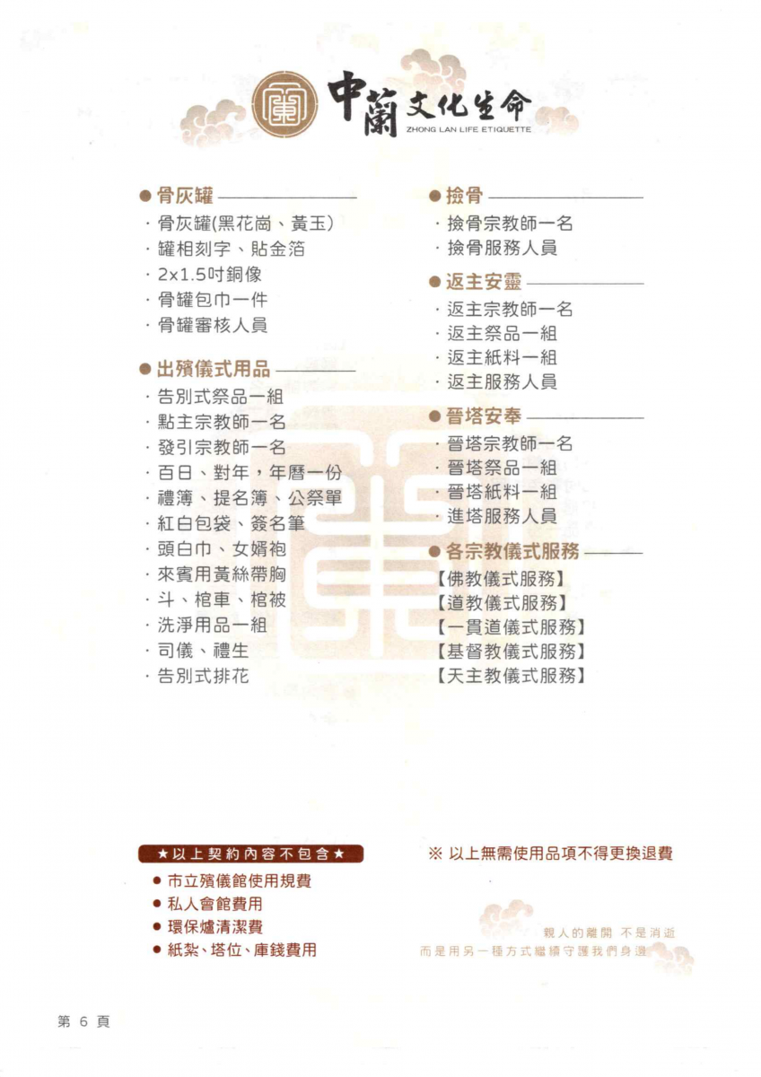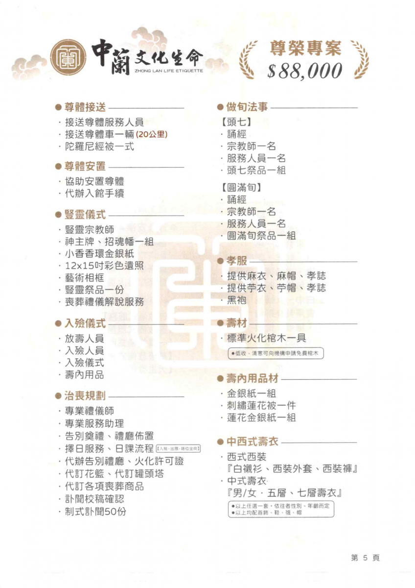 供提通中式或西式(擇一),火化服務使用,由中蘭禮儀所屬團隊執行。