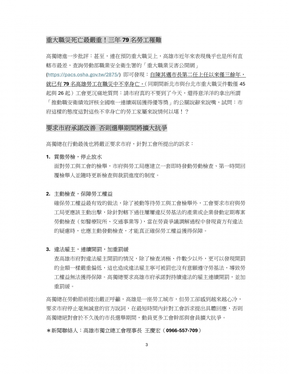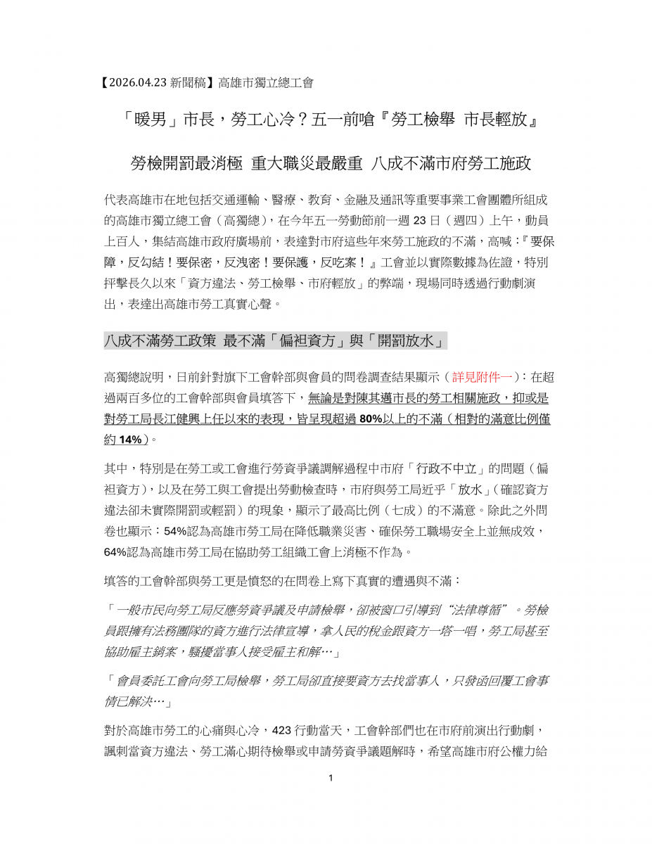 【20260423 高雄市獨立總工會新聞稿】「暖男」市長,勞工心冷?五一前嗆聲『勞工檢舉,市長輕放』