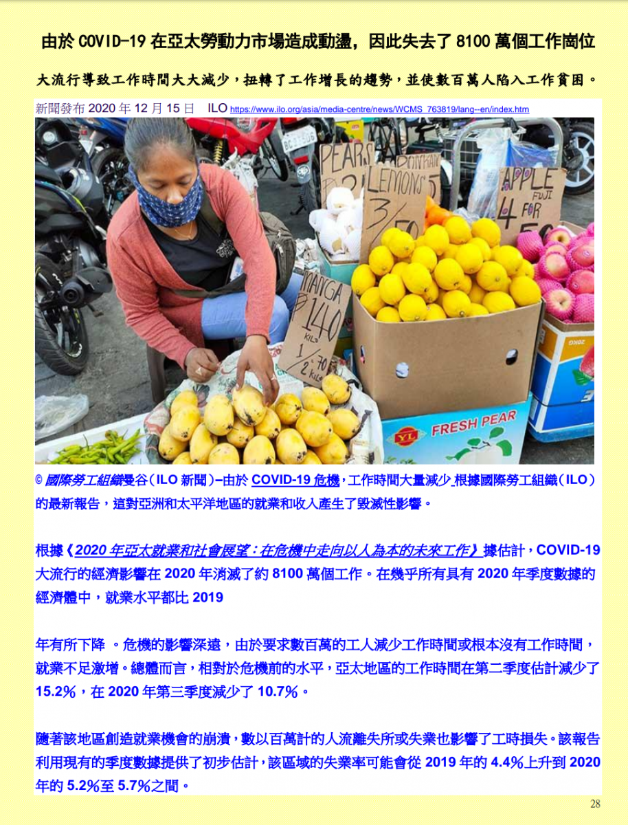 https://www.ilo.org/asia/media-centre/news/WCMS_763819/lang--en/index.htm 由於COVID-19在亞太勞動力市場造成動盪,因此失去了8100萬個工作崗位 大流行導致工作時間大大減少,扭