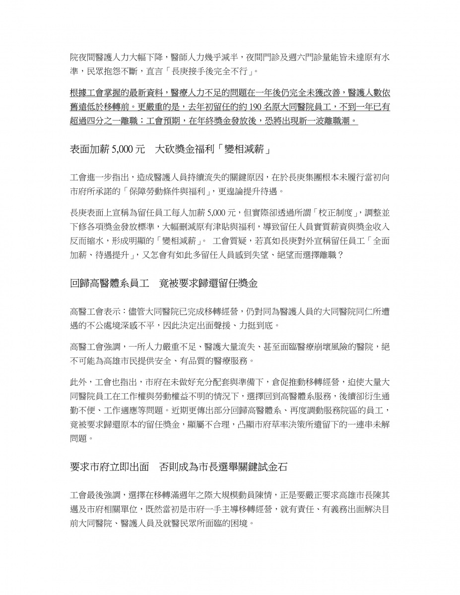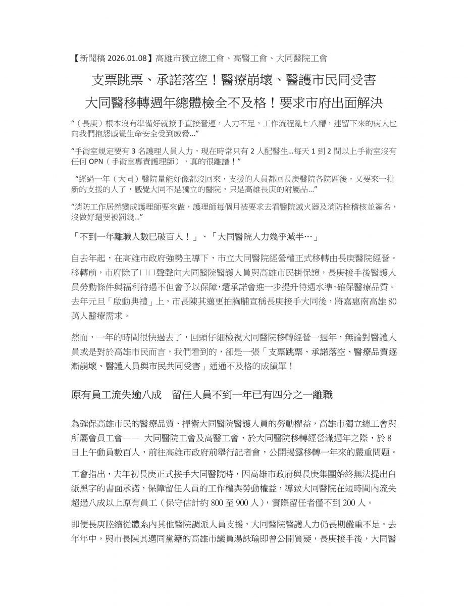 大同醫院移轉經營滿週年,我們也親眼見證,面對醫護人力大量流失、醫療品質持續崩壞這麼嚴重的問題,長庚資方與高雄市政府不但掩蓋真相、