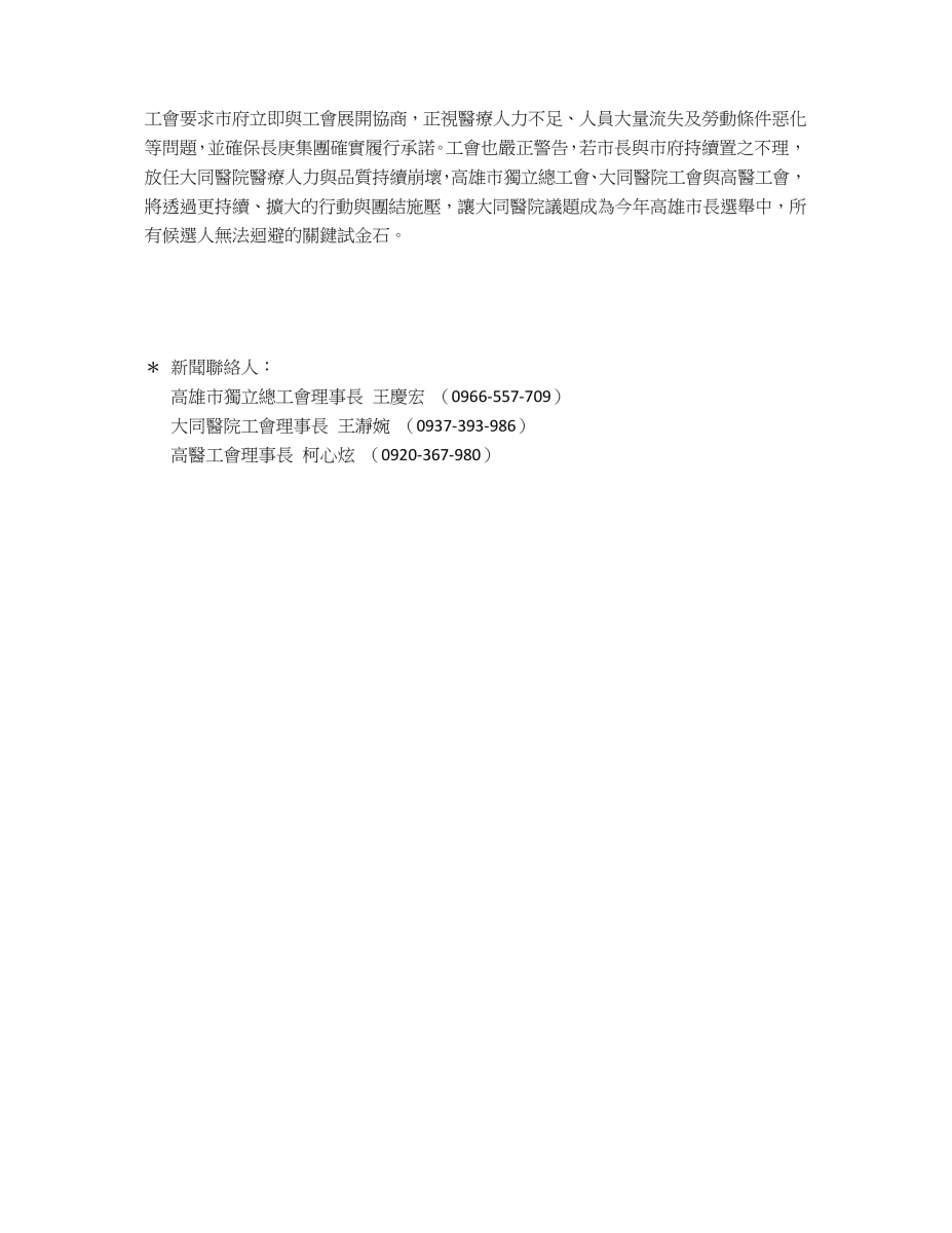 我們將持續要求市府正視問題、立即出面協商,確保醫療人力補足、勞動條件獲得實質保障,並監督經營單位確實履行承諾。