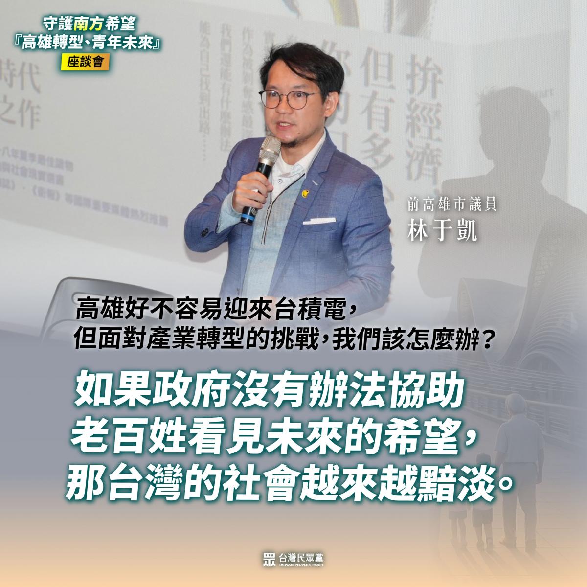 今天,民眾黨主席 黃國昌 與 創黨主席 柯文哲 來到港都高雄,參加 前高雄市議員 林于凱 舉辦的 守護南方希望:『高雄轉型、青年未來』座談,共同探討「其實每天都在發生、卻常被政治忽略」的事——人民到底還撐不撐得下去。